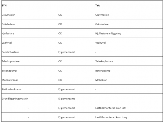 BYN erkänner* yrkesbevis för maskinförare utfärdade av TYA för de maskinslag som är gemensamma, enligt följande:
